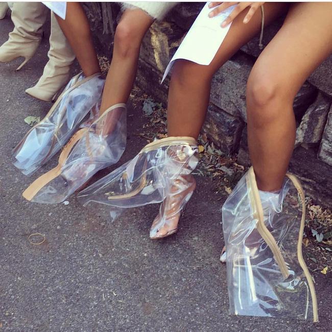 Mẫu boots trong suốt cao ngang đùi từng được giới thiệu lần đầu trong show diễn Yeezy Season 4. Ngay sau khi diễn xong, dàn mẫu đã không thể chịu nổi mà tháo ra ngay như thế này, bấy nhiêu đủ để biết là đôi boots này bí chân và nóng nực như thế nào.