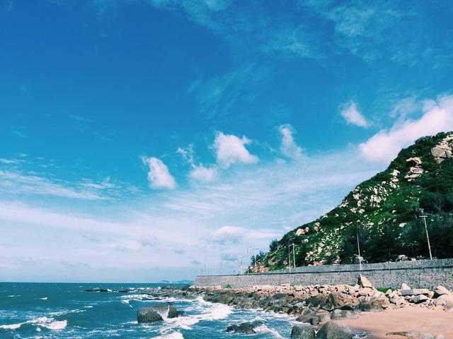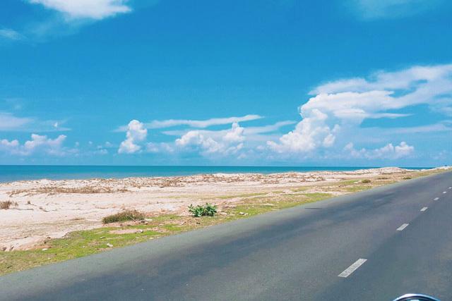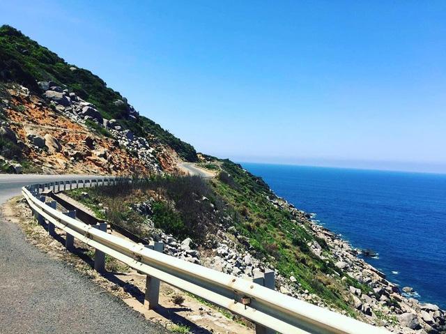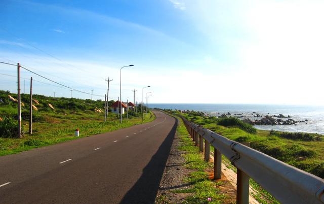 Trái ngược với cảnh đông đúc, tấp nập xe cộ trên quốc lộ, cung đường ven biển hầu như vắng hoe, chẳng có mấy xe qua lại, một địa điểm lý tưởng để check-in “sống ảo”.