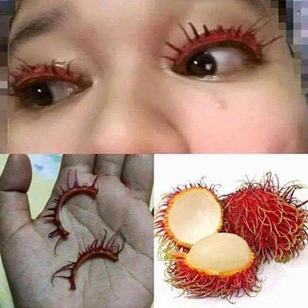 Cần gì phải bỏ hàng đống tiền ra mua mascara để chuốt mi, ngay cả những loại mascara lông giúp mi cong, dài, óng mượt cũng phải chạy dài khi thấy hình ảnh này. Rất đơn giản, bạn chỉ cần mua chôm chôm từ chợ về, ăn xong, giữ lại vỏ, cắt thành một đường vòng cung sao cho vừa với chiều dài mí mắt, cuối cùng là chỉ cần gắn lên là đã sở hữu bộ mi cong và dài rồi.