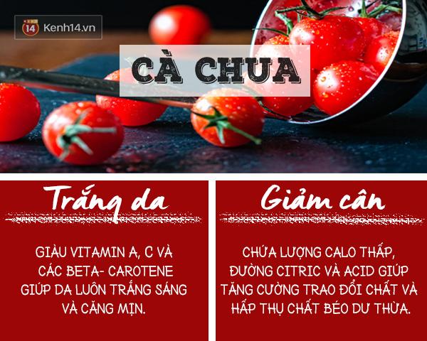 Cà chua là một loại nguyên liệu phổ biến trong các món ăn hằng ngày. Ngoài việc chứa nhiều các vitamin, beta- carotene giúp làm đẹp da, lượng đường Citric và các acid có trong chúng sẽ hấp thụ các chất béo dư thừa, tăng cường trao đổi chất, hỗ trợ cho quá trình giảm cân.