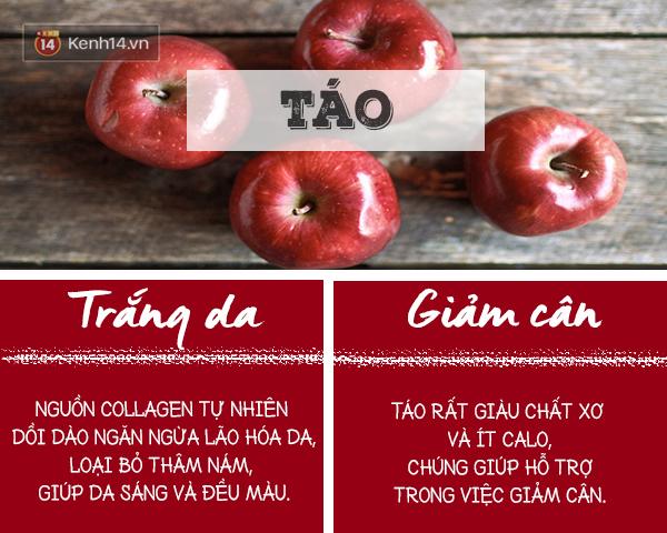 Táo là một nguồn cung cấp collagen tự nhiên cho cơ thể giúp ngăn ngừa lão hóa cho làn da. Lượng chất xơ dồi dào và lượng calo thấp trong táo giúp hỗ trợ hiệu quả cho quá trình giảm cân nữa đấy!
