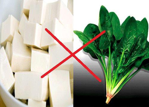 Đậu phụ chứa nhiều hai chất là magie clorua và canxi sunphat, trong khi đó cải bó xôi chứa axit oxalic. Khi kết hợp, nó sẽ tạo ra magie oxalate và canxi oxalate, hai chất kết tủa không tiêu này có thể ảnh hưởng tới sự hấp thụ canxi cũng như gây ra sỏi thận.