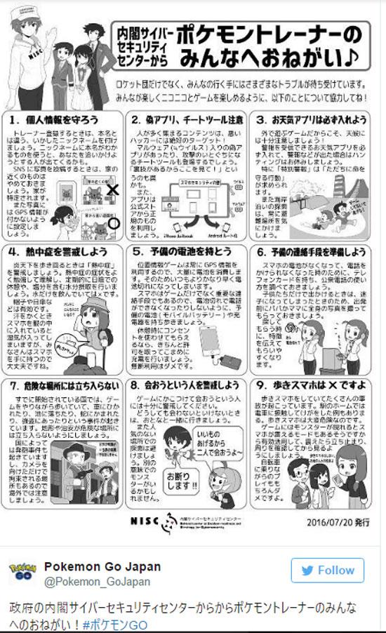 Cụ thể, vào ngày 20/7, cơ quan an ninh mạng chính phủ Nhật Bản đã đăng tải những tấm poster với nội dung làm thế nào để các game thủ an toàn khi chơi Pokemon GO trên trang Twitter và Line chính thức.