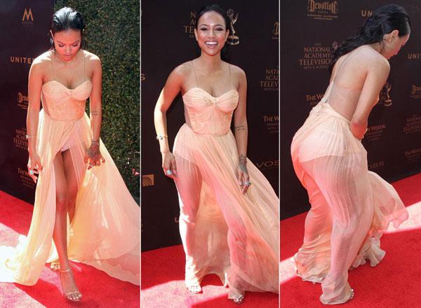 Người mẫu gốc Việt Karrueche Tran gặp sự cố vì váy xẻ quá cao trong khi những cơn gió không ngừng "trêu ghẹo" tại lễ trao giải Daytime Emmy 2016 hôm 1/5.
