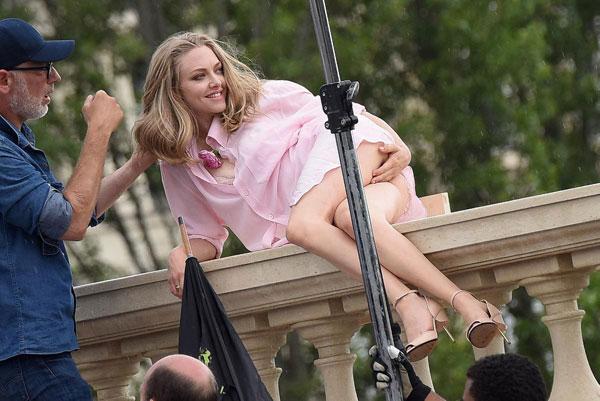 Cô đào Amanda Seyfried vừa tạo dáng, vừa che chắn khi nằm trên ban công chụp hình quảng cáo nước hoa Givenchy.