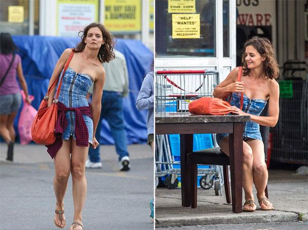 Katie Holmes lúng túng với bộ váy bò quá chật và ngắn.