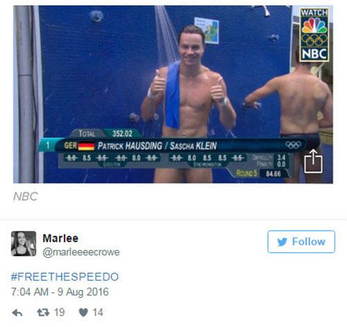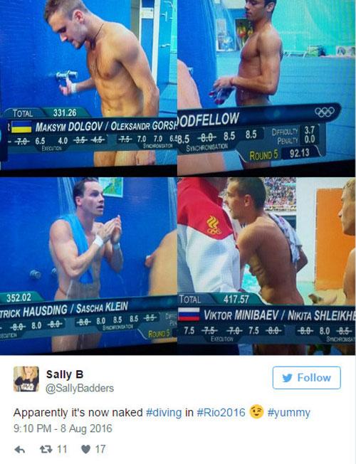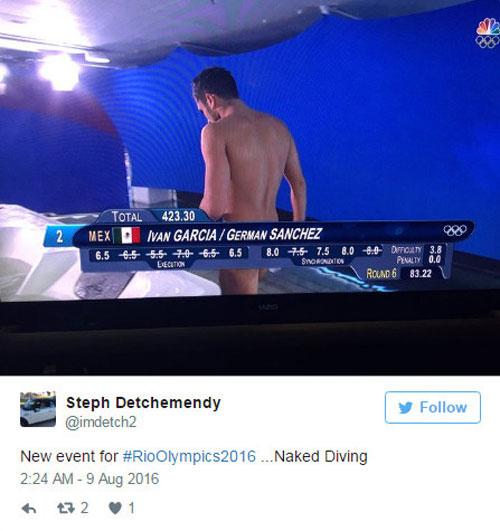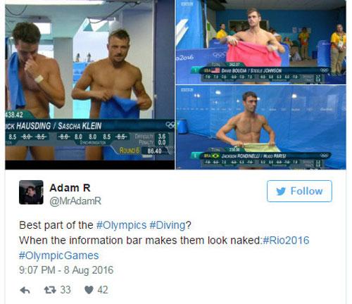 Đề tài thu hút nhiều bình luận hài hước nhất trên Twitter nhiều ngày qua chính là những hình ảnh các VĐV nhảy cầu trông như không mặc quần khi bị các bảng thông tin che đúng phần dưới. 'Phần hay nhất của Olympic, nhảy cầu chăng? Khi bảng thông tin khiến họ trông như khỏa thân', một tài khoản Twitter hài hước bình luận.
