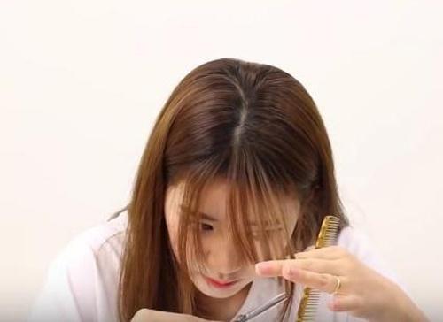 Bước 2: Dùng kéo cắt thẳng qua lọn tóc buộc trước trán. Lưu ý, bạn cần cắt tóc dài qua lông mày một chút vì tóc mái ngắn hơn lông mày sẽ tạo cảm giác cũn cỡn.