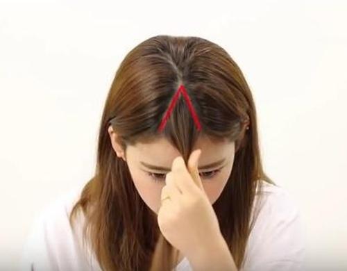 Bước 1: Bạn lấy một lọn tóc nhỏ ở chính giữa trán sao cho chân của lọn tóc tạo thành hình mũi tên đối xứng như hình 1. Sau đó, bạn cột gọn lọn tóc này lại, phần tóc còn lại búi gọn gàng.