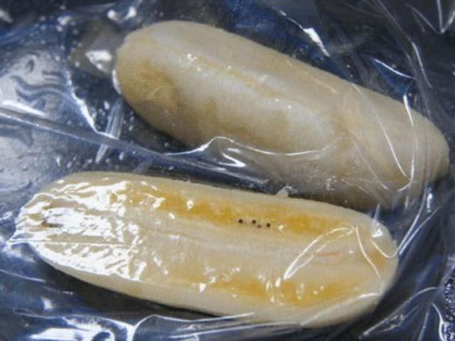 - Bước 1: Lột vỏ chuối, cắt chuối làm đôi theo chiều dọc rồi cho chuối vào một chiếc túi ni lông sạch, dùng dao ấn xuống để chuối dẹp.