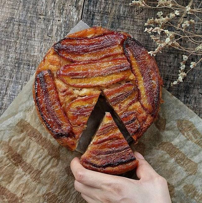 - Để bánh có nhiều lớp đẹp mắt, chúng ta cần xếp xen kẽ hỗn hợp và chuối lát theo thứ tự như sau: hỗn hợp sau đó đến chuối rồi lại hỗn hợp và lại là chuối. Nên chọn những lát chuối đẹp nhất để thực hiện cho phần chuối bề mặt trên cùng của bánh giúp chiếc bánh trông ngon miệng hơn.