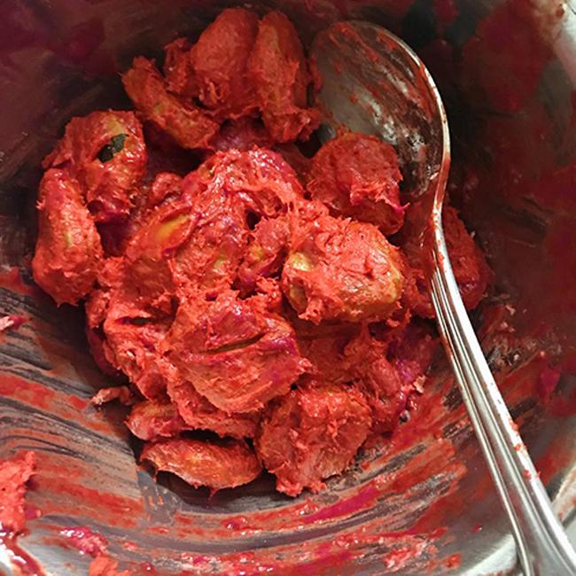 - Bổ gấc làm đôi, lấy ruột, bỏ hạt và đổ một chút rượu vào đánh.