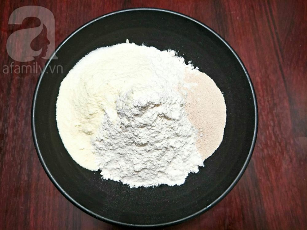 Cho bột mì, muối, đường, sữa bột vào 1 cái tô to rồi trộn đều sau đó cho men nở vào tô bột trộn đều lên.