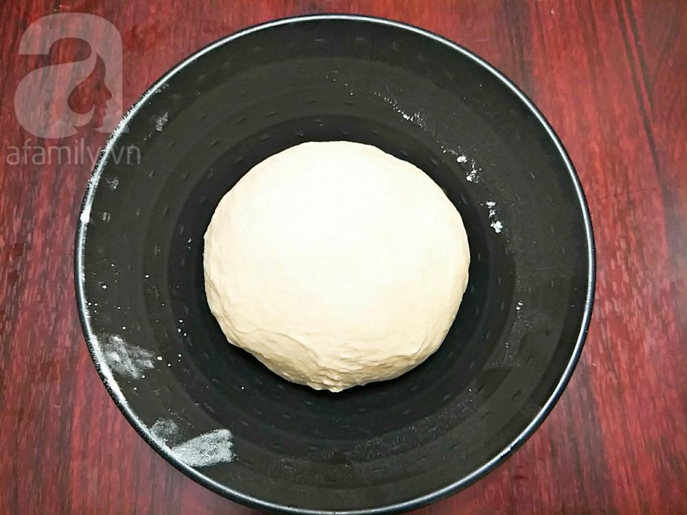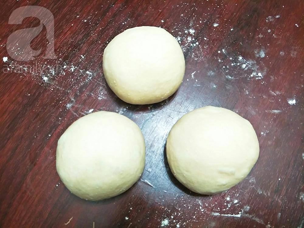 Rắc 1 chút bột mì lên bàn sạch và lấy khối bột ra, ấn cho xẹp bọt khí có trong bột sau đó bạn chia bột thành 3 miếng to đều nhau, làm tròn miếng bột và đậy kín lại, để bột nghỉ 10 phút.