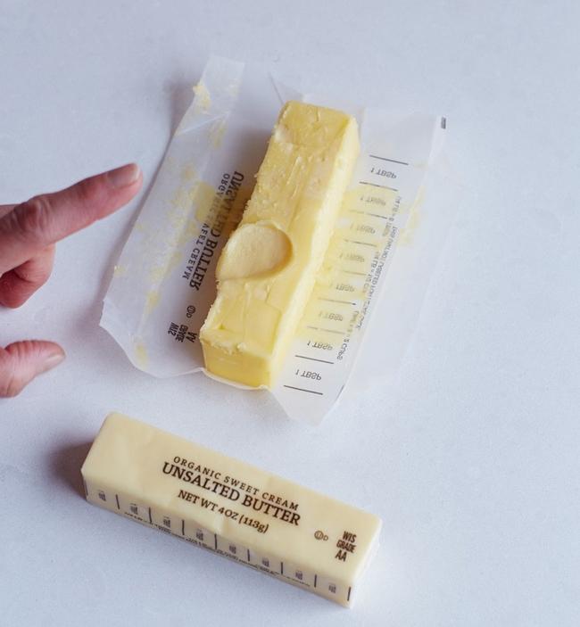 Bơ cần được làm mềm trước khi làm bánh khoảng 1 tiếng. Bạn có thể làm mềm bơ ở nhiệt độ phòng hoặc cho vào lò vi sóng quay khoảng 10 giây.