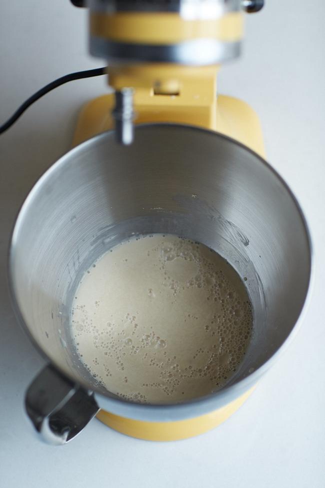 Tiếp đến trộn men nở và nước vào trong tô của máy trộn, để khoảng vài phút cho men nở tan. Sau đó cho thêm đường, trứng và đánh tan ra. Cho tiếp muối và bột mì rồi bắt đầu trộn.