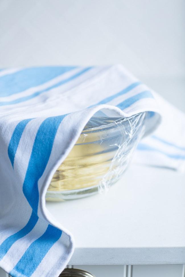 Dùng vải đậy lại rồi ủ bột từ 1 đến 1,5 tiếng trong nhiệt độ phòng. Tiếp đến đậy bột bằng màng bọc thực phẩm rồi để qua đêm trong tủ lạnh sẽ giúp bánh thơm ngon hơn. Nếu bột nở cao hơn chiếc bát, bạn cũng không nên nén bột xuống mà cần tách bột xung quanh viền tô để hơi thoát ra ngoài.