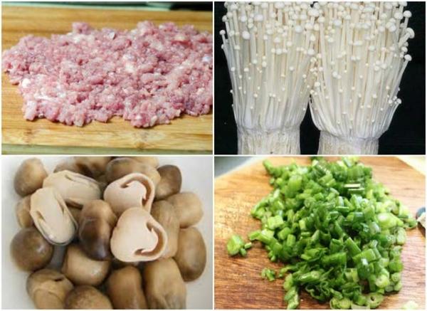 - Bước 1 (sơ chế nguyên liệu): Thịt nạc rửa sạch thái mỏng, băm nhỏ.