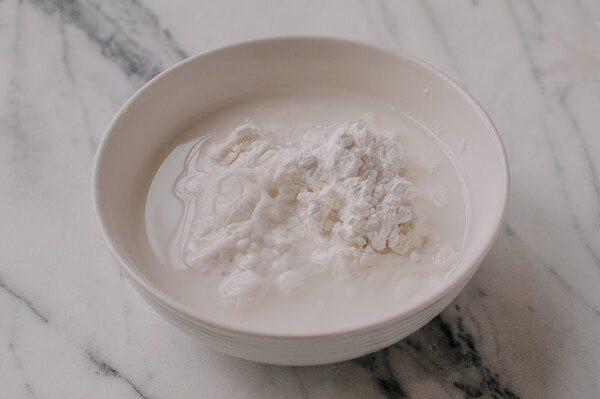 Cho phần bột khoai tây, 64g bột mì, 112g nước vào trộn đều.