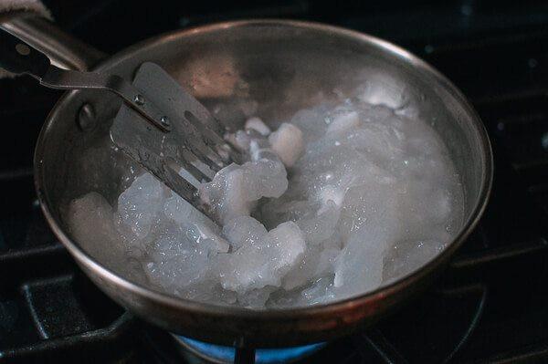 Trong 1 chảo chống dính đổ phần nước sôi 300g vào đun sôi thì từ từ đổ phần bột nước ở trên vào, khuấy đều cho tới khi bột trong thì tắt bếp.