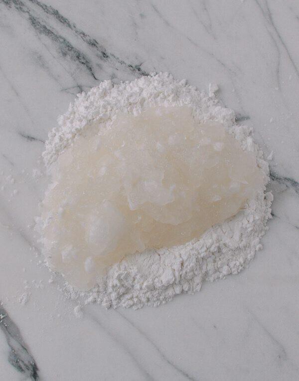 Trên một mặt phẳng sạch đổ 128g bột mì khô vào sau đó đổ phần bột ướt lên, trộn kỹ.