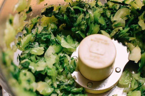 Vắt ráo nước rồi thái nhỏ hoặc cho vào máy, xay nhỏ. Cà rốt, nấm hương rửa sạch, thái miếng nhỏ rồi chần qua với nước sôi sau đó cũng cho sang bát nước đá cho nguội rồi thái nhỏ hoặc xay nhỏ.