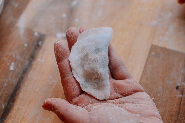 Cán bột thành từng miếng tròn rồi đặt nhân vào giữa, dính mép bột lại thành hình bán nguyệt.
