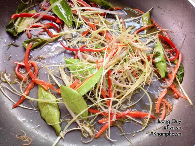 Bước 4: Vẫn chảo đó đổ bớt dầu còn lại, để lại một ít rồi cho sả, ớt, lá chanh vào đảo sơ thấy lá chanh vào giòn là được.