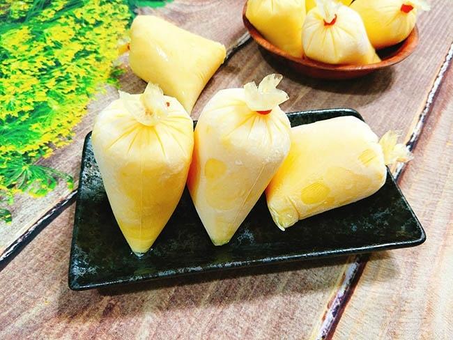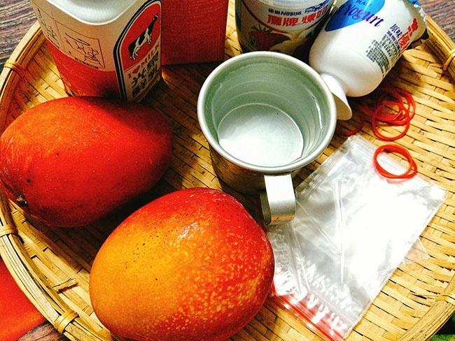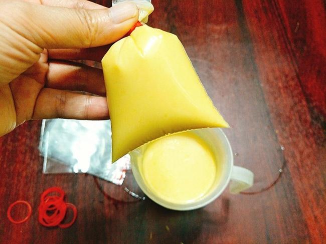- Bước 6: Bạn múc sữa chua xoài vào 1 chiếc ca có miệng phễu để rót cho dễ sau đó rót sữa đầy khoảng 1 nửa túi, dùng dây nịt buộc chặt lại. Cứ như vậy bạn rót sữa vào các túi cho hết nguyên liệu.