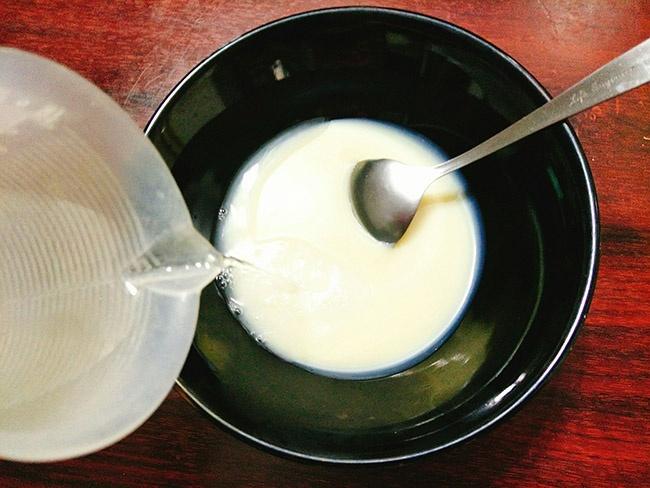 - Bước 1: Cho nước sôi vào 1 cái tô to rồi thêm sữa đặc và khuấy đều cho hòa tan.