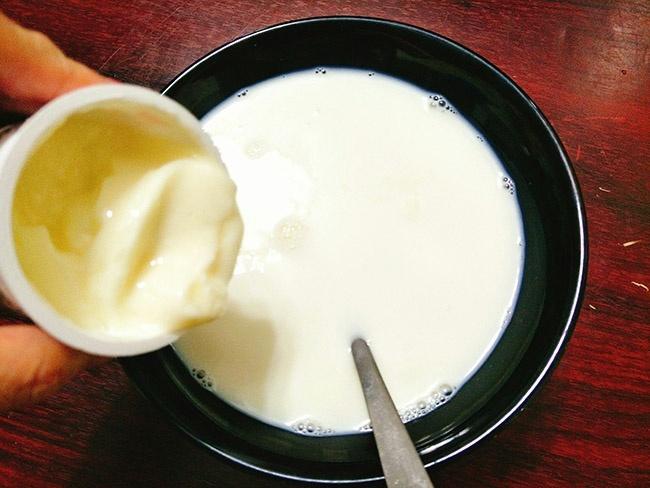 - Bước 2: Tiếp theo bạn cho sữa tươi vào cùng, khuấy đều nguyên liệu mới cho sữa chua mua sẵn và khuấy đều thêm 1 lần nữa cho nguyên liệu hòa đều.