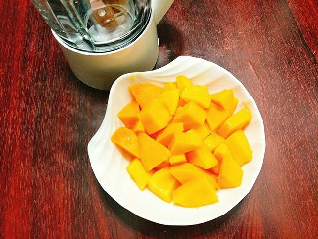 Xoài gọt sạch vỏ, cắt xoài thành những miếng nhỏ rồi đem xay nhuyễn. Bạn có thể lọc xoài qua rây nếu xoài có sơ, như vậy chúng ta sẽ được phần thịt xoài mịn nhất.