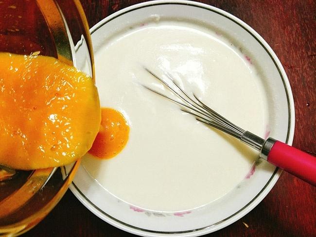 - Bước 5: Lấy tô sữa chua ra và thêm phần thịt xoài đã xay nhuyễn vào cùng, khuấy đều nguyên liệu.