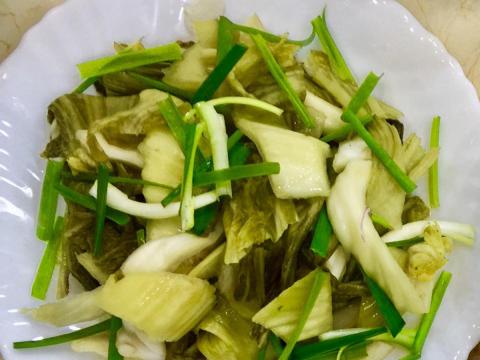 • Hành củ, hành lá rửa sạch. Sau đó, cắt khúc cải và hành dài chừng 5cm.
