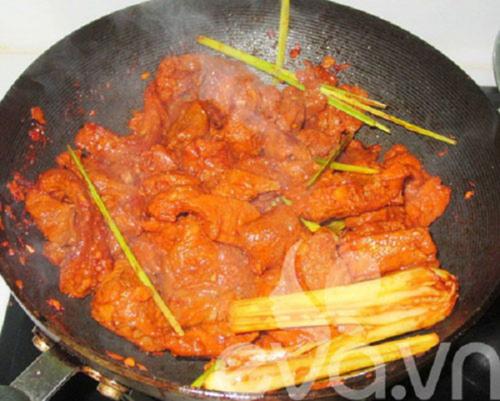 5, Tỏi, hành tím, gừng băm nhỏ rồi phi thơm. Sau đó cho toàn bộ thịt bò đã ướp vào đảo đều đến khi thịt săn lại thì cho thêm sả băm vào đảo tiếp. Tiếp tục đổ thêm nước săm sắp thịt, cho hoa hồi, quế vào nồi sau đó đậy vung lại đun ở lửa vừa khoảng 30 phút.