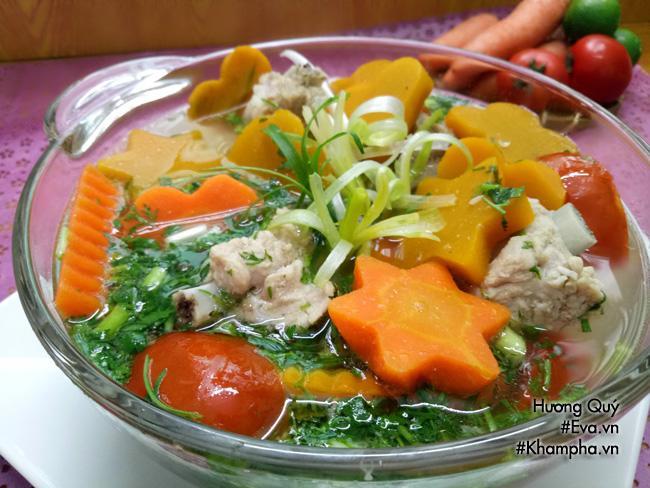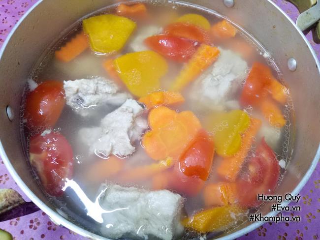 Bước 4: Khi thấy sườn hầm đã chín bạn nêm nếm gia vị cho vừa miệng rồi cho các loại củ quả vào. Ưu tiên bí đỏ, cà rốt sau đó đến cà chua, không nên hầm lâu củ quả sẽ bị nát, mất ngon.