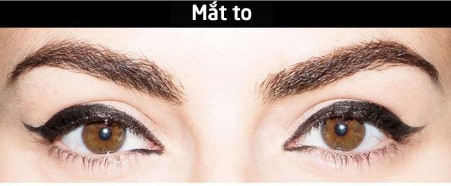 Mắt to là một lợi thế và rất thích hợp để vẽ dạng mắt mèo. Dùng bút chì kẻ mắt màu đen tạo một hình chữ V mỏng ở phần đuôi mắt. Sau đó, dùng chì kẻ mắt dạng nước vẽ đè lên đồng thời để tạo phần đuôi mắt đậm và sắc nét.
