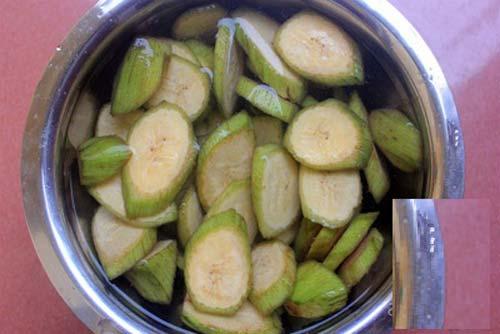 - Thả chuối vào chậu nước muối ngâm khoảng 15-20 phút để nhựa chuối được loại bỏ bớt và lớp vỏ không bị thâm.