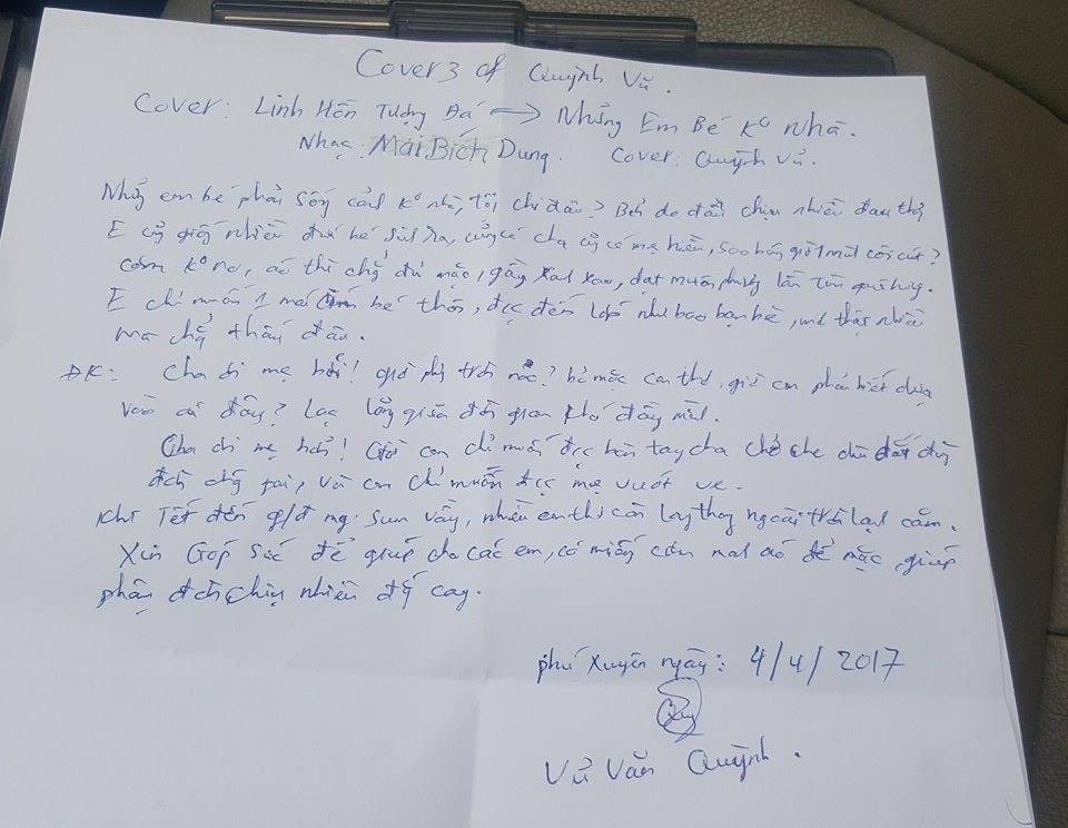 Chia sẻ về lý do lại lựa chọn chủ đề ý nghĩa này để sáng tác - Vũ Quỳnh xúc động cho hay: "Nghề lái xe thường xuyên phải đi nhiều nơi, cũng phải chứng kiến không biết bao những em bé lang thang đi trên đường xin từng miếng ăn hay nhặt từng cái chai nhựa, bìa cát tông... để mưu sinh cuộc sống mà không biết bố mẹ chúng là ai, còn hay đã mất. Thấy vậy, tôi thực sự cảm thấy rất xúc động và thương các em nhiều lắm.