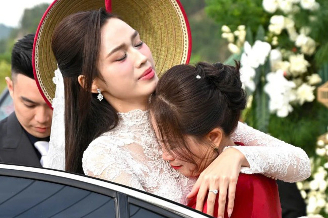 Trong khi đó chú rể Viết Vương diện vest bảnh bao, phong thái điềm đạm. Cả hai nắm chặt tay, trao nhau ánh mắt đong đầy hạnh phúc trong ngày trọng đại.