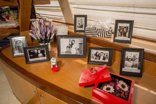 Phòng khách sang trọng được bài trí tinh tế trên du thuyền. Bên cạnh vật dụng, nhiều hình ảnh đẹp của Lý Nhã Kỳ cũng được chủ nhân phô trương