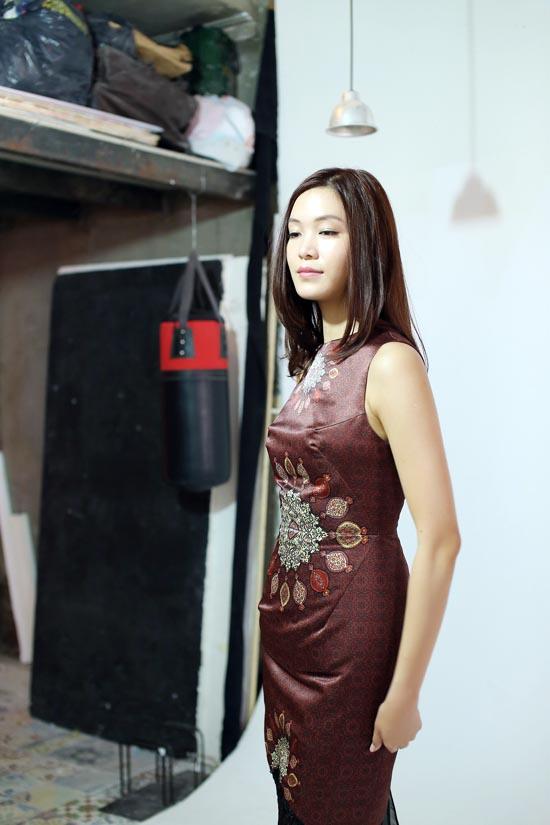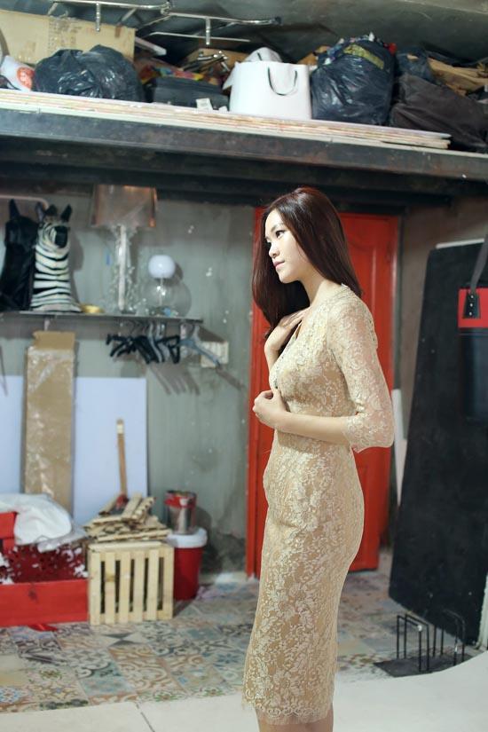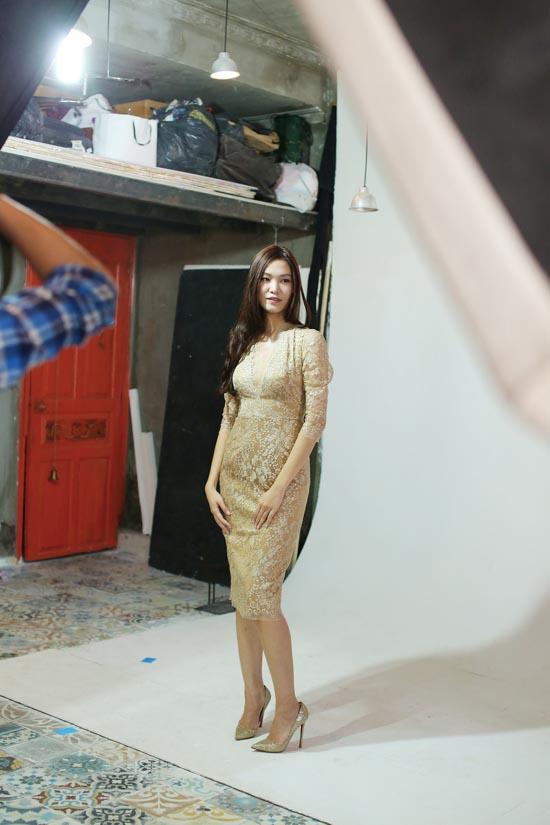 Tại buổi thử đồ, Thùy Dung chọn cho mình những bộ đồ có màu sắc, phong cách khác nhau. Các bộ trang phục đều ôm bó sát người, tô điểm bằng chất liệu ren pha họa tiết hiện đại kết hợp với truyền thống càng tôn lên vẻ đẹp của cô.