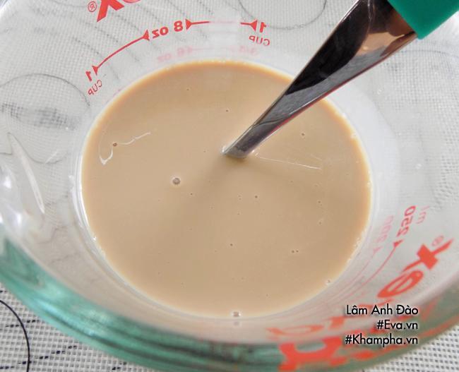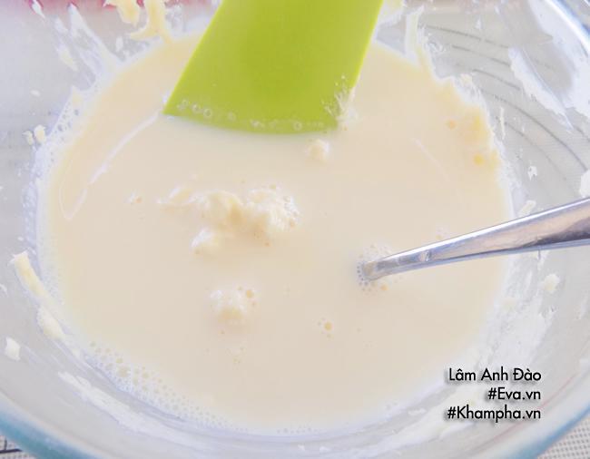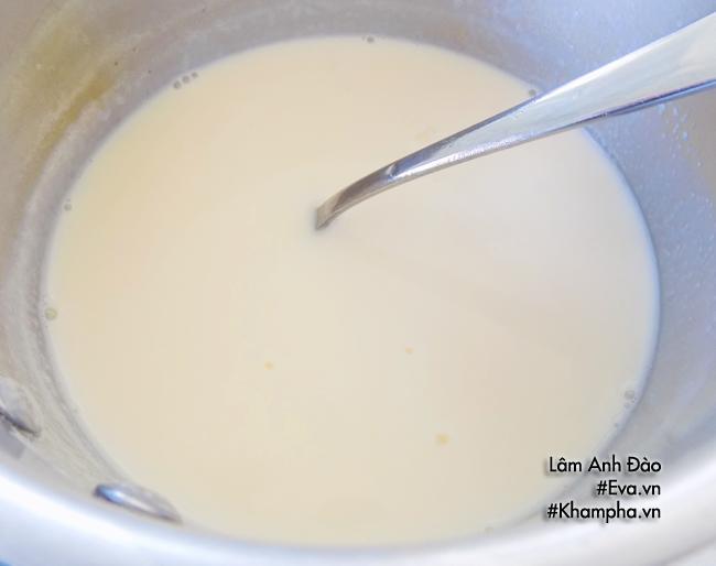 Bước 4: Sau đó đổ hỗn hợp sữa vào âu phô mai khuấy đều, lược qua rây.
