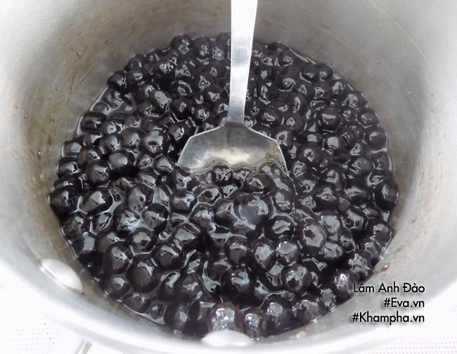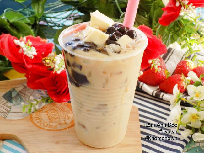 Bước 7: Trân châu, thạch phô mai tươi cho ra ly. Đổ trà sữa vào hơn 2/3ly, tiếp theo là cho đá đập nhỏ vào là hoàn tất.