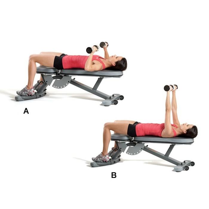 Đây là một bài tập tác động lên cơ ngực, cơ vai và cơ tay sau. Đầu tiên, bạn hãy nằm ngửa trên ghế và nâng 2 quả tạ lên phía trên vai. Từ từ hạ tạ xuống phía dưới và đồng thời mở rộng cánh tay sang 2 bên sao cho cánh tay với cẳng tay tạo thành 1 góc 90 độ. Dùng cơ ngực đẩy quả tạ lên, thở ra. Lặp lại động tác nhiều lần liên tiếp.