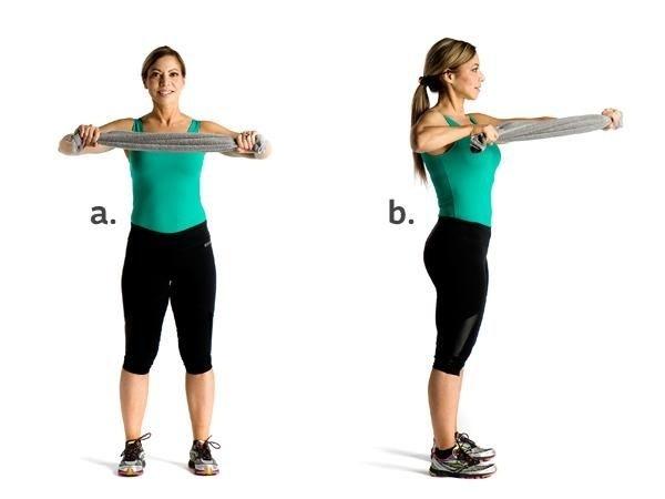 Bài tập này giúp thúc đẩy tăng kích thước ngực. Bạn cần chuẩn bị một chiếc khăn tay. Bạn hãy đứng thẳng, chân rộng bằng vai. Hai tay duỗi ra và kéo căng khăn theo chiều dọc trong 3 phút rồi trở về tư thế ban đầu. Thực hiện 8-10 lần, tập ít nhất 3 lần 1 tuần để đạt kết quả tốt nhất.