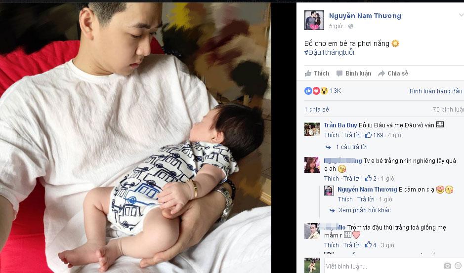 Bé Đậu nhà Ba Duy - Nam Thương sinh ngày 15/3/2016. Đến nay bé đã tròn 1 tháng tuổi. Mới đây nhất, trên trang cá nhân của mình Nam Thương đăng tải hình ảnh Ba Duy cực điển trai bế bé Đậu khiến bạn bè rất thích thú.