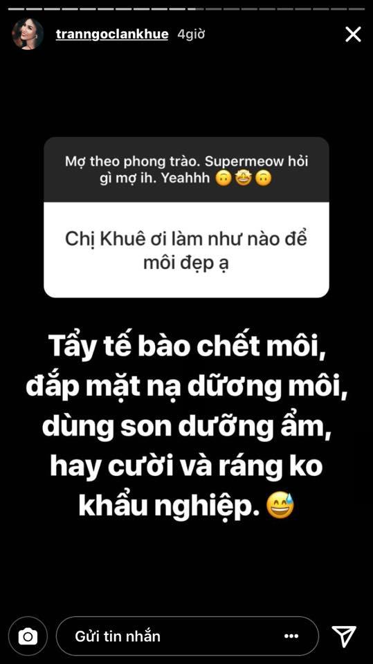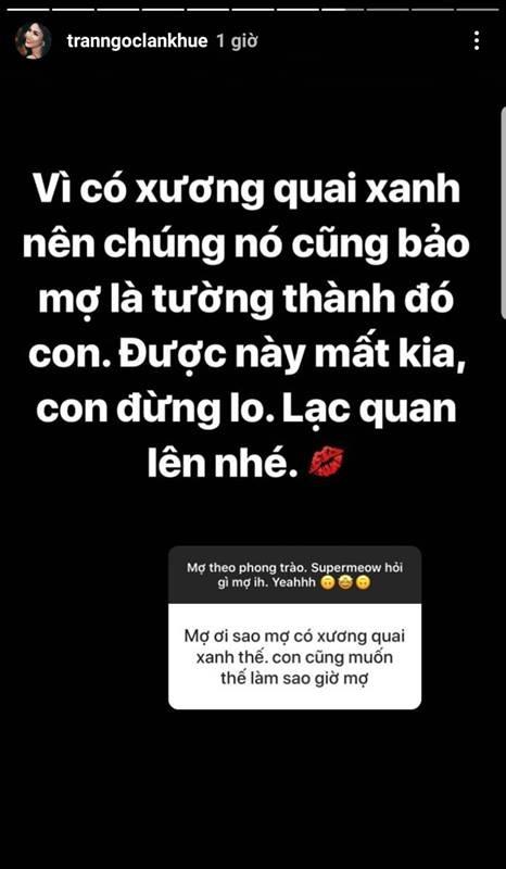 Khi được fan khen ngợi xương quai xanh, Lan Khuê đáp không thể hài hơn: "Vì có xương quai xanh nên chúng nó cũng bảo mợ là tường thành đó con. Lạc quan lên nhé".