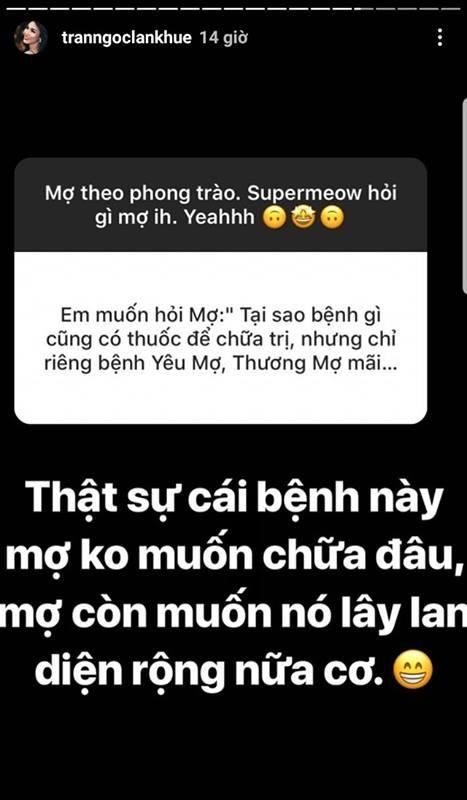 Khi được một fan hài hước hỏi xoáy "Mèo có người yêu chưa?", chân dài họ Trần lanh lợi đáp xoay: "Huhu, sắp lấy chồng tới nơi rồi mà. Thứ gì...".