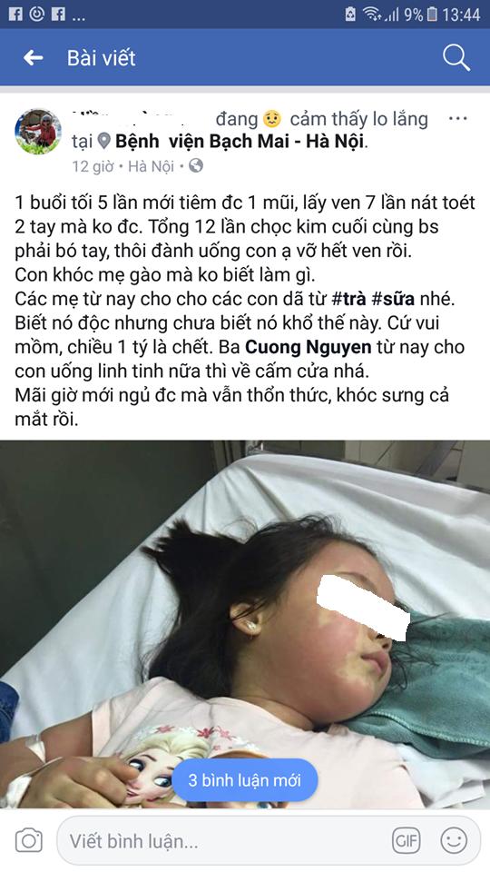 Ngay sau dòng trạng thái đã có hơn 6.000 lượt chia sẻ và 2 triệu người thích. Chia sẻ với PV Báo Gia đình và Xã hội, theo mẹ bé gái thì nguyên nhân gây ra ngộ độc cho bé là do trà sữa. Bé gái 5 tuổi này đang được cấp cứu tại Bệnh viện Bạch Mai.
